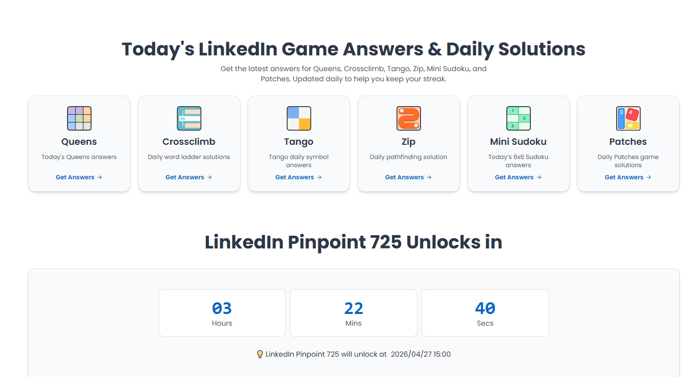 We are an all-in-one companion for solving and mastering LinkedIn puzzle games. Whether you're stuck, trying to keep your streak, or want to understand the logic behind answers, our platform provides instant solutions, clear explanations, and useful strategies across multiple games in one place.
